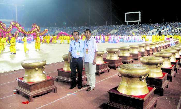 | Hai nghệ nhân Thanh Hóa bên dãy trống đồng dịp Đại lễ 1000 năm Thăng Long |