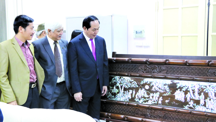 | Chủ tịch nước Trần Đại Quang thăm cơ sở sản xuất bức tranh khảm trai “Trúc Lâm Đại sĩ xuất sơn đồ” Ảnh: Nguyễn Đình Toán |