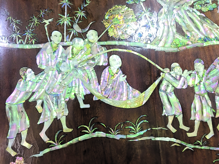 | Tranh khảm trai và họa tiết in trên bình gốm miêu tả tích đức Trần Anh Tông ra đón vua cha về kinh |