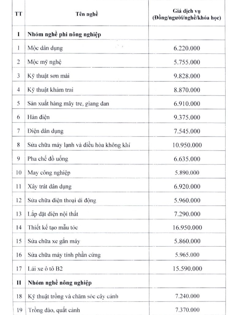 Giá dịch vụ đào tạo đối với 30 nghề trình độ sơ cấp áp dụng trong lĩnh vực giáo dục nghề nghiệp thuộc 2 nhóm nghề: Nông nghiệp và phi nông nghiệp.