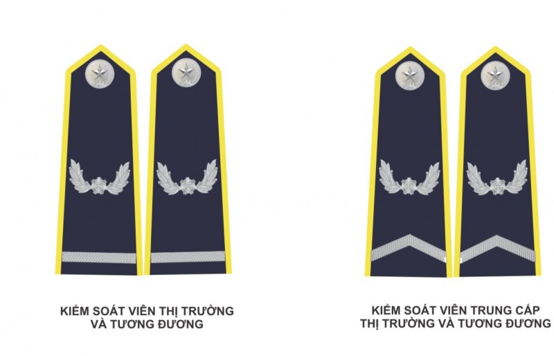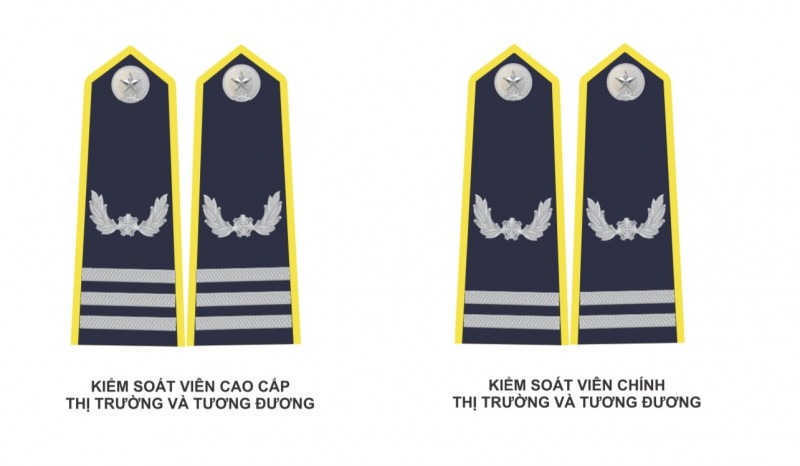 Cụ thể, Cấp hiệu Quản lý thị trường gắn trên vai áo: hình thang, đầu nhỏ vát nhọn cân, ba mặt gồm chiều dài và đầu vát nhọn (đầu nhỏ) có viền màu vàng. Nền cấp hiệu màu xanh đen, bề mặt vải có các gân nổi.