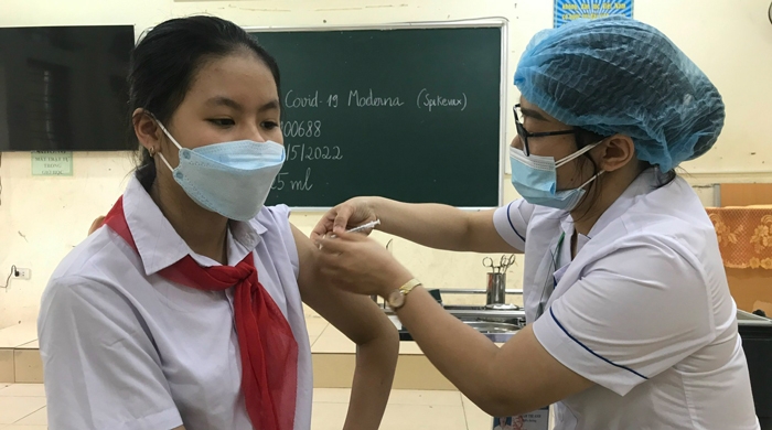 | Học sinh lớp 6 tại Trường THCS thị trấn Phú Xuyên được tiêm vaccine Moderna trong chiều 16/4 |