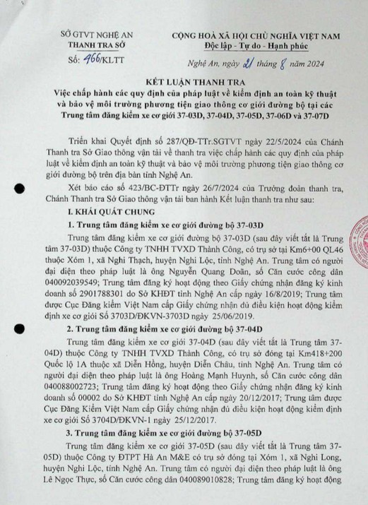 | Liên quan đến hoạt động đăng kiểm của Công ty Thành Công, mới đây ngày 21/8/2024, Thanh tra Sở Giao thông vận tải tỉnh Nghệ An đã ban hành kết luận thanh tra số 466 (Ảnh chụp màn hình) |