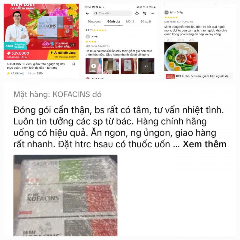 Có thể dẫn chứng một số bình luận về sản phẩm thực phẩm bảo vệ sức khỏe Dạ dày KOFACINS, như: “Thuốc rất hiệu quả”, “Mình dùng hết một liệu trình và kết quả ngoài mong đợi không còn cảm giác trào ngược khó chịu…”, “bác sĩ tư vấn rất có tâm, mới uống hết một hộp mà hết men gan cao, sẽ ủng hộ tiếp”…
