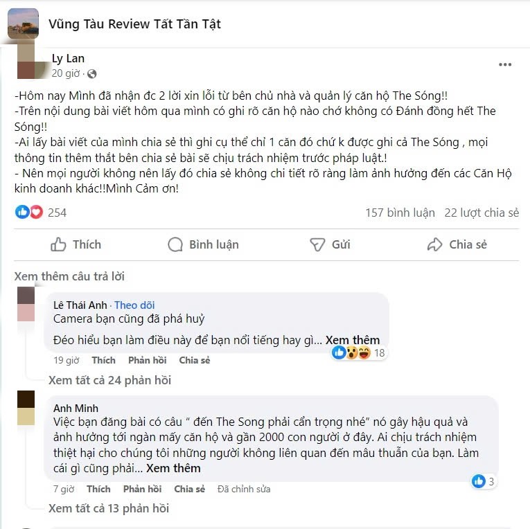 Cụ thể, vị khách này thông tin, đã nhận được lời xin lỗi từ phía chủ nhà cũng như quản lý tại căn hộ The Sóng.