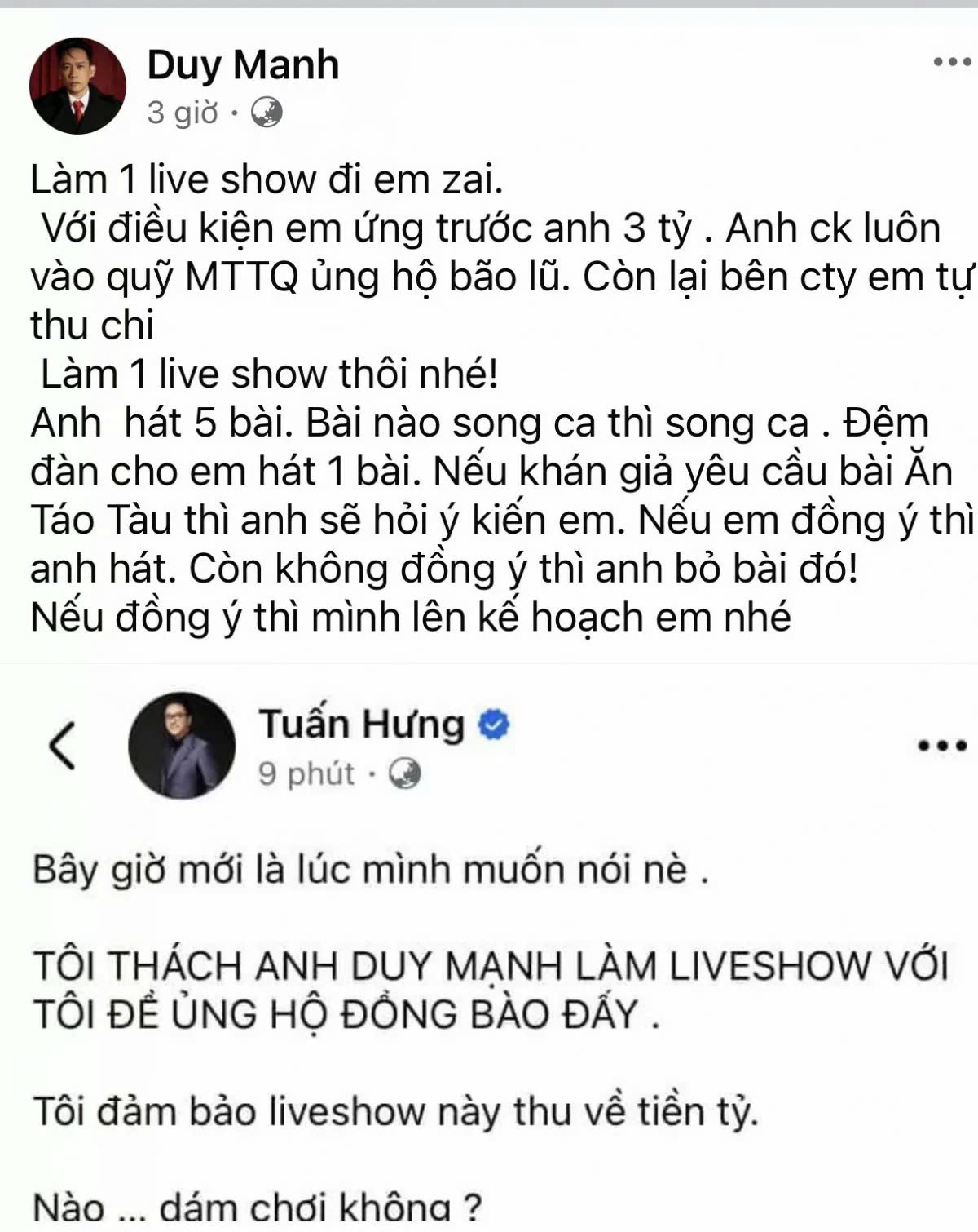 | Lời "thách" tổ chức liveshow ủng hộ đồng bào vùng lũ của Tuấn Hưng và Duy Mạnh (Ảnh chụp màn hình) |
