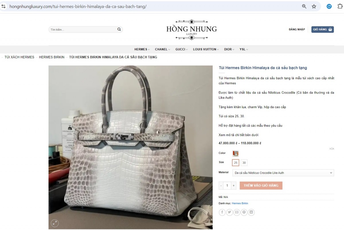 Tương tự, websiet có tên miền “hongnhungluxury.com” có bán “Túi Hermes Birkin Himalaya da cá sấu bạch tạng”, được làm từ “chất liệu da cá sấu Niloticus Crocodile” có giá dao động từ 47.000.000 đồng - 118.000.000 đồng. Khi mua khách hàng còn được tặng kèm khăn lụa, hộp da cao cấp.