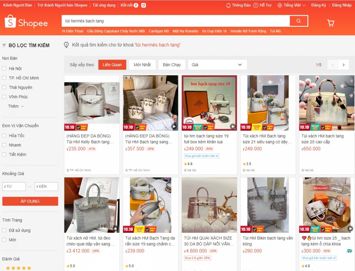 Tại sàn thương mại điện tử Shopee, không khó để tìm mua một chiếc túi Hermes bạch tạng, chất liệu thì từ.... da rắn, da bò, da PU,..