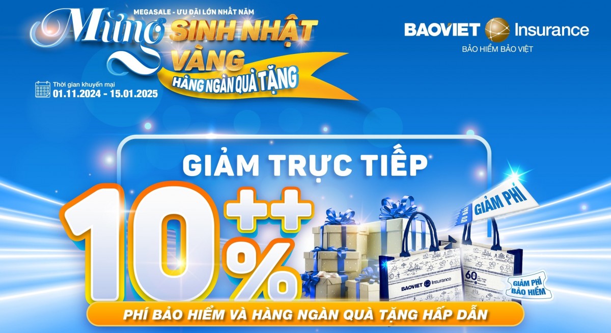 “Mừng sinh nhật vàng - Hàng ngàn quà tặng” - Đại tiệc ưu đãi cực hấp dẫn với tổng giá trị lên đến 15 tỷ đồng từ Bảo hiểm Bảo Việt dành tặng khách hàng tham gia các gói bảo hiểm trong thời gian từ 1/11/2024 đến 15/1/2025.