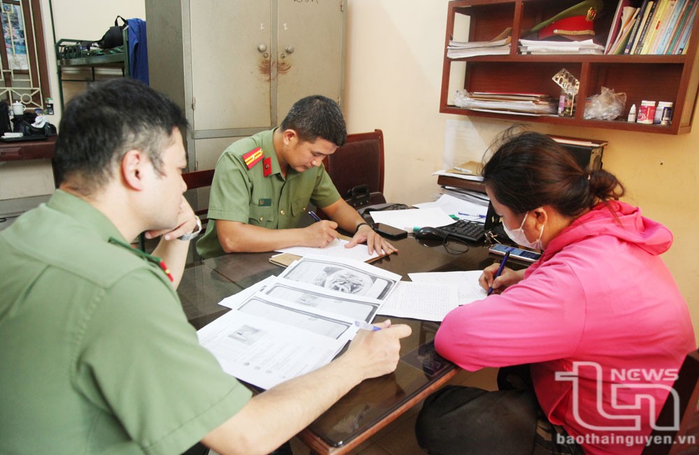| Công an Thái Nguyên làm việc với đối tượng Nguyễn Thị N.- người tung tin giả về HIV. Ảnh: Báo Thái Nguyên |