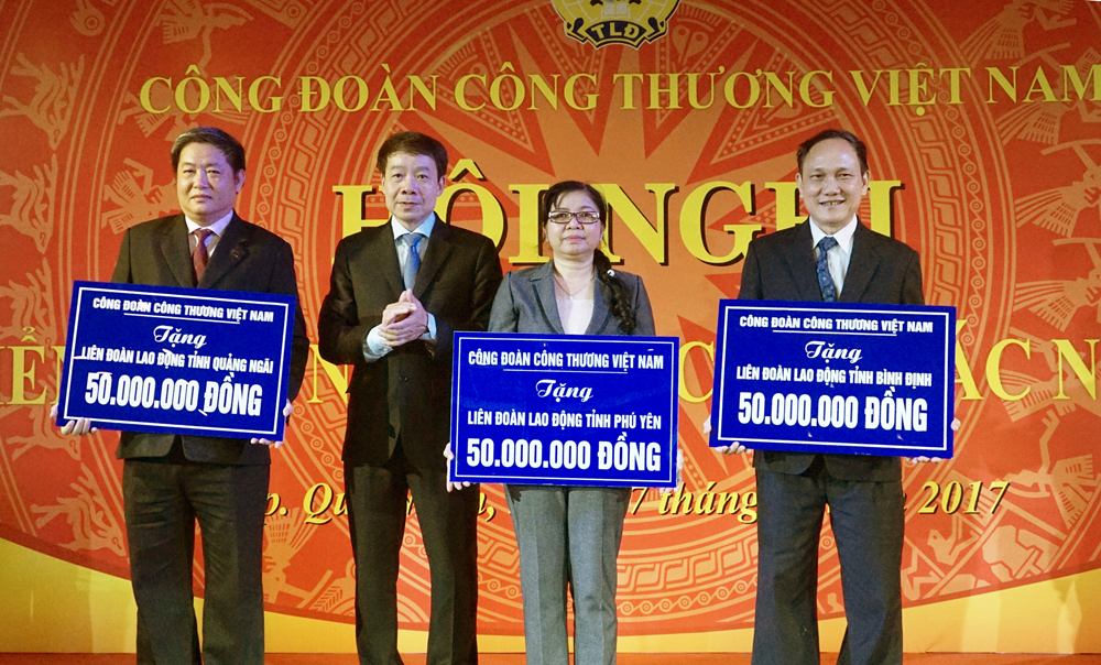 | Ông Lý Quốc Hùng - Chủ tịch CĐCTVN - trao tặng tiền hỗ trợ cho đại diện lãnh đạo công đoàn 3 tỉnh Bình Định, Phú Yên và Quảng Ngãi |
