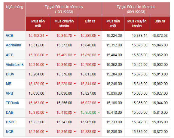 Tại Ngân hàng Vietcombank, so sánh với tỷ giá trong phiên giao dịch đầu giờ sáng ngày hôm qua (9/11), sáng nay 10/11, tỷ giá AUD tiếp tục được điều chỉnh giảm mạnh ở hai chiều mua vào và bán ra. Tỷ giá mua vào là 15.094,63 VNĐ/AUD, giảm 113 đồng; tỷ giá bán ra là 15.737,29 VNĐ/AUD giảm 117 đồng.