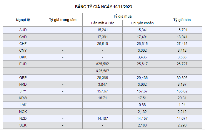 Tỷ giá AUD hôm nay 10/11/2023 tại ngân hàng Vietcombank. Ảnh chụp website màn hình