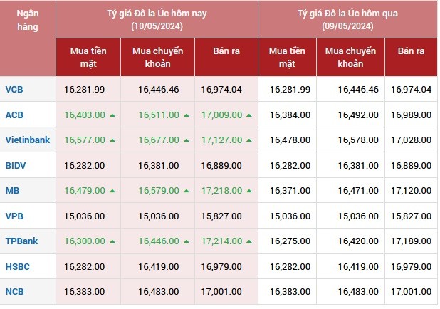 So sánh tỷ giá Đô la Úc (AUD) giữa 9 ngân hàng lớn nhất Việt Nam, hôm nay 10/5/2024 tỷ giá AUD ở chiều mua vào có 4 ngân hàng tăng giá mua, 0 ngân hàng giảm giá mua và 5 ngân hàng giữ nguyên giá mua vào so với hôm qua.