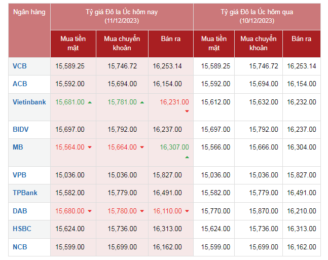 Tại Ngân hàng Vietcombank, so sánh với tỷ giá trong phiên giao dịch đầu giờ sáng hôm qua (10/12), sáng nay 11/12, tỷ giá AUD đã được ngân hàng này điều chỉnh giảm mức giá. Tỷ giá đô la Úc chiều mua vào là 15,511 VNĐ/AUD, giảm 78 đồng; tỷ giá đô la Úc bán ra là 16,171 VNĐ/AUD, giảm 82 đồng.