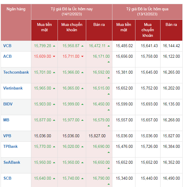 Tại Ngân hàng Vietcombank, so sánh với tỷ giá trong phiên giao dịch đầu giờ sáng hôm qua (13/12), sáng nay 14/12, tỷ giá AUD đã được ngân hàng này điều chỉnh tăng mức giá. Tỷ giá đô la Úc chiều mua vào là 15,799 VNĐ/AUD, tăng 288 đồng; tỷ giá đô la Úc bán ra là 16,472 VNĐ/AUD, tăng 301 đồng.