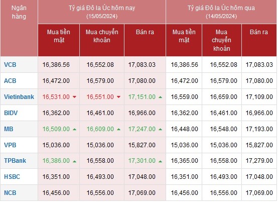 Ngân hàng Vietinbank mua đô Úc ở mức 16,531 VND/AUD và bán ra ở mức 17,151 VND/AUD, giảm 28 đồng ở chiều mua vào nhưng lại tăng 42 đồng ở chiều bán ra.