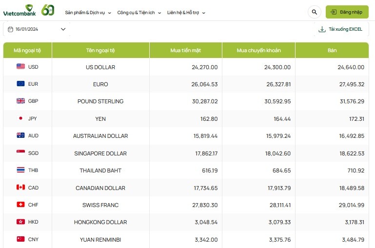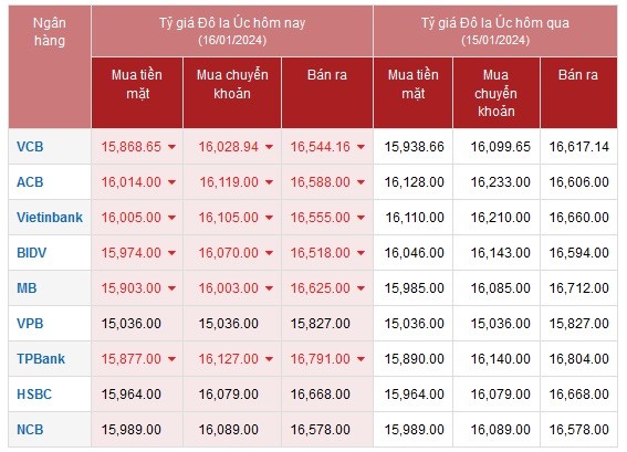 Tại Ngân hàng Vietcombank, so sánh với sáng qua (15/1), hôm nay tỷ giá AUD được ngân hàng điều chỉnh giảm mạnh mức giá. Tỷ giá đô la Úc chiều mua vào là 15,819 VNĐ/AUD, giảm 135 đồng; tỷ giá đô la Úc bán ra là 16,492 VNĐ/AUD, giảm mạnh 142 đồng.