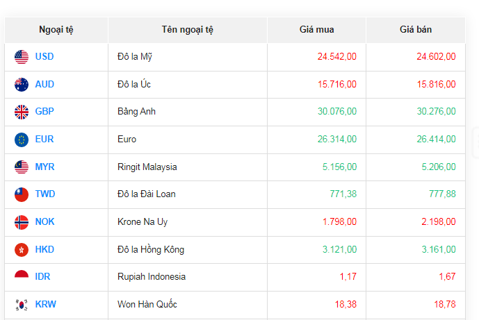 Ở chiều ngược lại, ngân hàng MB điều chỉnh giảm tỷ giá AUD. Tỷ giá mua vào là 15.334 VNĐ/AUD giảm 69 đồng, tỷ giá bân ra là 16.054 VNĐ/AUD giảm 55 đồng.