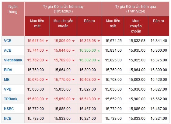 Tại Ngân hàng Vietcombank, so sánh với sáng qua (17/1), hôm nay tỷ giá AUD tiếp tục được ngân hàng điều chỉnh giảm mạnh mức giá. Tỷ giá đô la Úc chiều mua vào là 15,647 VNĐ/AUD, giảm 105 đồng; tỷ giá đô la Úc bán ra là 16,313 VNĐ/AUD, giảm 129 đồng.