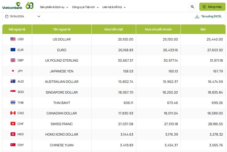 | Tỷ giá AUD hôm nay 19/4/2024 tại Vietcombank. Ảnh chụp màn hình lúc 7h |