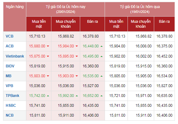 | Tỷ giá AUD hôm nay 20/1/2024 khảo sát tại một số ngân hàng. |