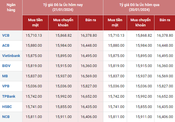 Tại Ngân hàng Vietcombank, so sánh với sáng qua (20/1), hôm nay tỷ giá AUD được ngân hàng điều chỉnh giữ nguyên mức giá. Tỷ giá đô la Úc chiều mua vào là 15,710 VNĐ/AUD; tỷ giá đô la Úc bán ra là 16,378 VNĐ/AUD.