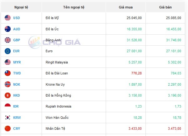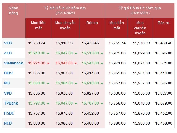 Tại Ngân hàng Vietcombank, so sánh với sáng qua (24/1), hôm nay tỷ giá AUD được ngân hàng điều chỉnh tăng nhẹ mức giá. Tỷ giá Đô la Úc chiều mua vào là 15,759 VNĐ/AUD, tăng 10 đồng; tỷ giá Đô la Úc bán ra là 16,430 VNĐ/AUD cùng tăng 11 đồng.
