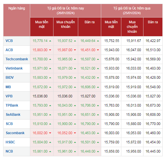 | Tỷ giá AUD hôm nay 26/1/2024 khảo sát tại một số ngân hàng |