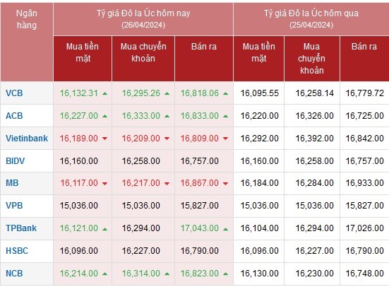 So sánh tỷ giá Đô la Úc (AUD) giữa 9 ngân hàng lớn nhất Việt Nam, hôm nay 26/4/2024 tỷ giá AUD ở chiều mua vào có 4 ngân hàng tăng giá mua, 2 ngân hàng giảm giá mua và 3 ngân hàng giữ nguyên giá mua vào so với hôm qua.