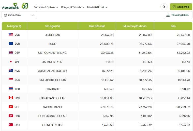 | Tỷ giá AUD hôm nay 26/4/2024 tại Ngân hàng Vietcombank. Ảnh chụp màn hình lúc 6h |