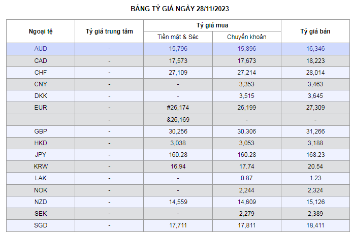 | Tỷ giá AUD hôm nay 28/11/2023 tại Ngân hàng Vietcombank. Ảnh chụp màn hình |