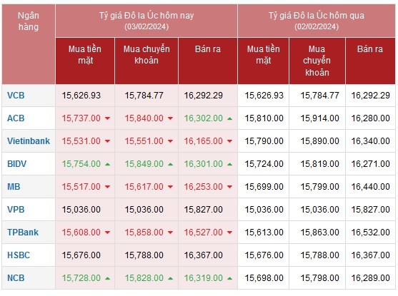| Tỷ giá AUD hôm nay 3/2/2024 khảo sát tại một số Ngân hàng |