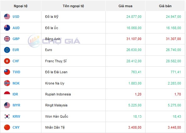 Tương tự, tại Ngân hàng MB, giá đô la Úc chiều mua vào ở mức 15,517 VNĐ/AUD giảm 182 đồng; tỷ giá AUD chiều bán ở mức 16,253 VNĐ/AUD giảm 187 đồng.