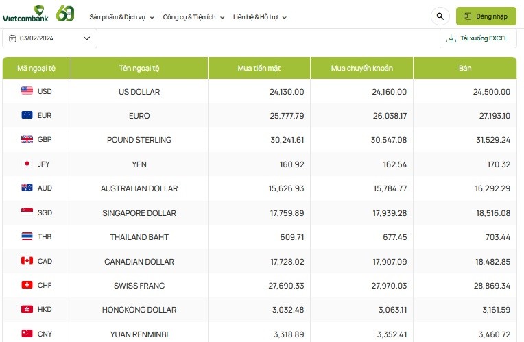 | Tỷ giá AUD hôm nay 3/2/2024 tại Ngân hàng Vietcombank. Ảnh chụp website màn hình lúc 05h00 |