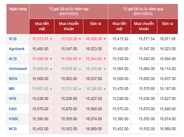 Tại Ngân hàng Vietcombank, so sánh với tỷ giá trong phiên giao dịch đầu giờ sáng ngày hôm qua (3/11), rạng sáng nay 4/11, tỷ giá AUD được điều chỉnh giảm ở hai chiều mua vào và bán ra. Tỷ giá mua vào là 15.373,97 VNĐ/AUD, giảm nhẹ 8 đồng; tỷ giá bán ra là 16.028,36 VNĐ/AUD giảm 12 đồng.