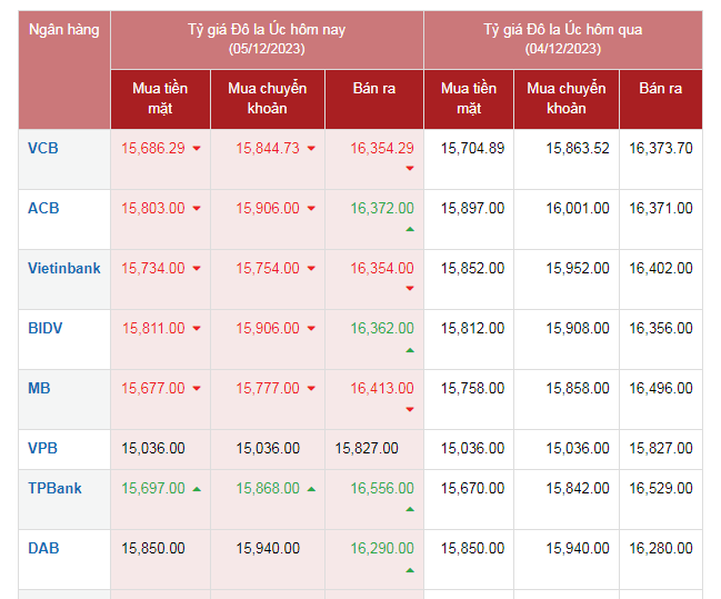Tại Ngân hàng Vietcombank, so sánh với tỷ giá trong phiên giao dịch đầu giờ sáng hôm qua (4/12), sáng nay 5/12, tỷ giá AUD đã được ngân hàng này điều chỉnh giảm nhẹ mức giá. Tỷ giá AUD mua vào là 15,686 VNĐ/AUD, giảm 18 đồng; tỷ giá đô la Úc bán ra là 16,354 VNĐ/AUD, giảm 19 đồng.