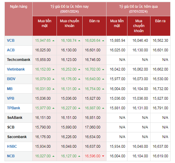 | Tỷ giá AUD hôm nay 8/1/2024 tại chợ giá |