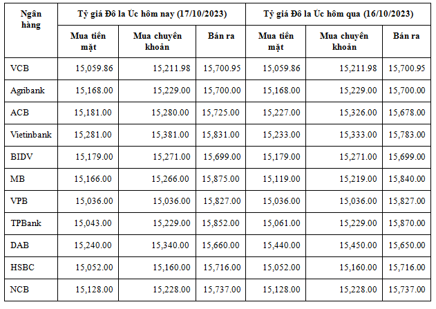 | Tỷ giá đô la Úc hôm nay 17/10/2023 khảo sát tại nhiều ngân hàng |