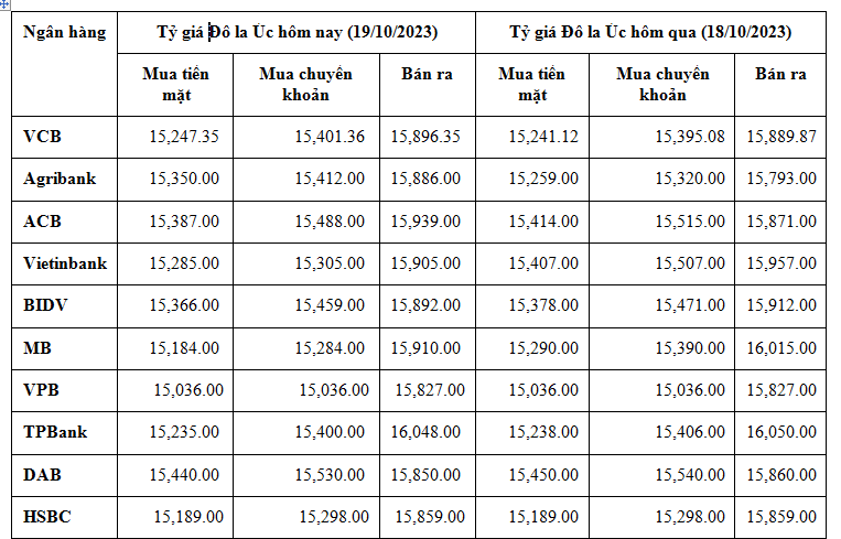 Ngày 19/10/2023, tỷ giá đô la Úc(AUD) thay đổi theo chiều hướng giảm ở nhiều ngân hàng. Tại phiên giao dịch đầu giờ sáng, tỷ giá đô la Úc tại Ngân hàng Vietcombank tăng giá ở cả hai chiều mua bán. Theo đó, tỷ giá bán ra là 15.247,35 VNĐ/AUDD tăng 78 đồng, tỷ giá mua vào là 15.896,25 VNĐ/AUD, tăng 81 đồng.