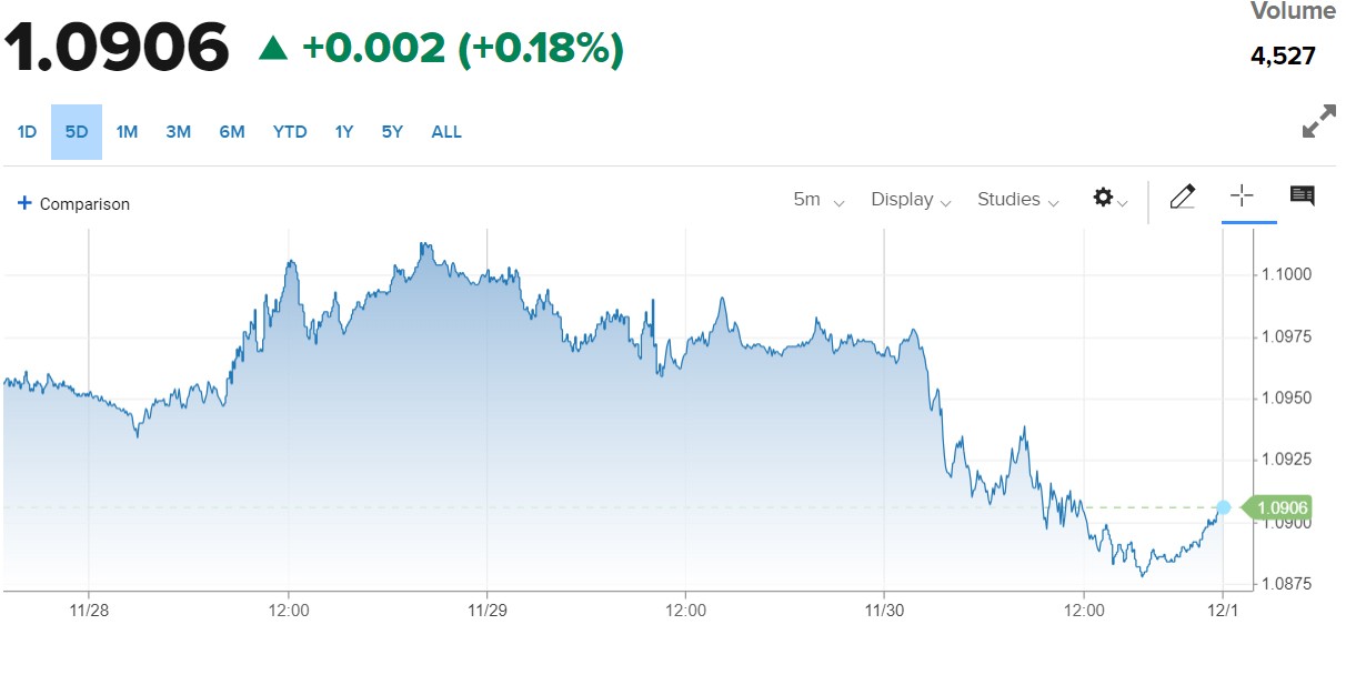| Diễn biến tỷ giá EUR/USD trên thị trường thế giới (Nguồn: CNBC) |