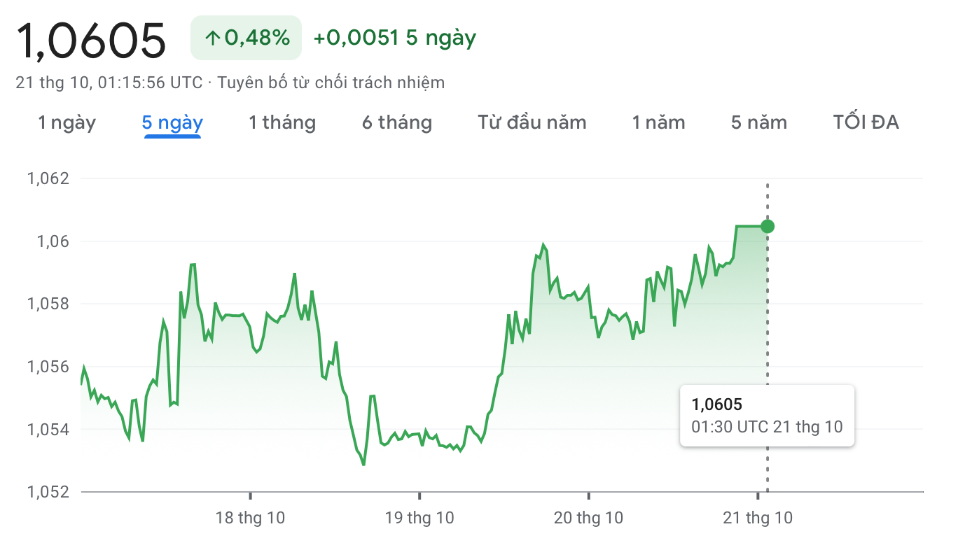 Diễn biến tỷ giá Euro trên thị trường thế giới cho thấy, chỉ số EUR/USD hiện đang ở mức 1.0605, tăng 0.0051 điểm, tương đương 0.48% so với phiên đầu tuần.