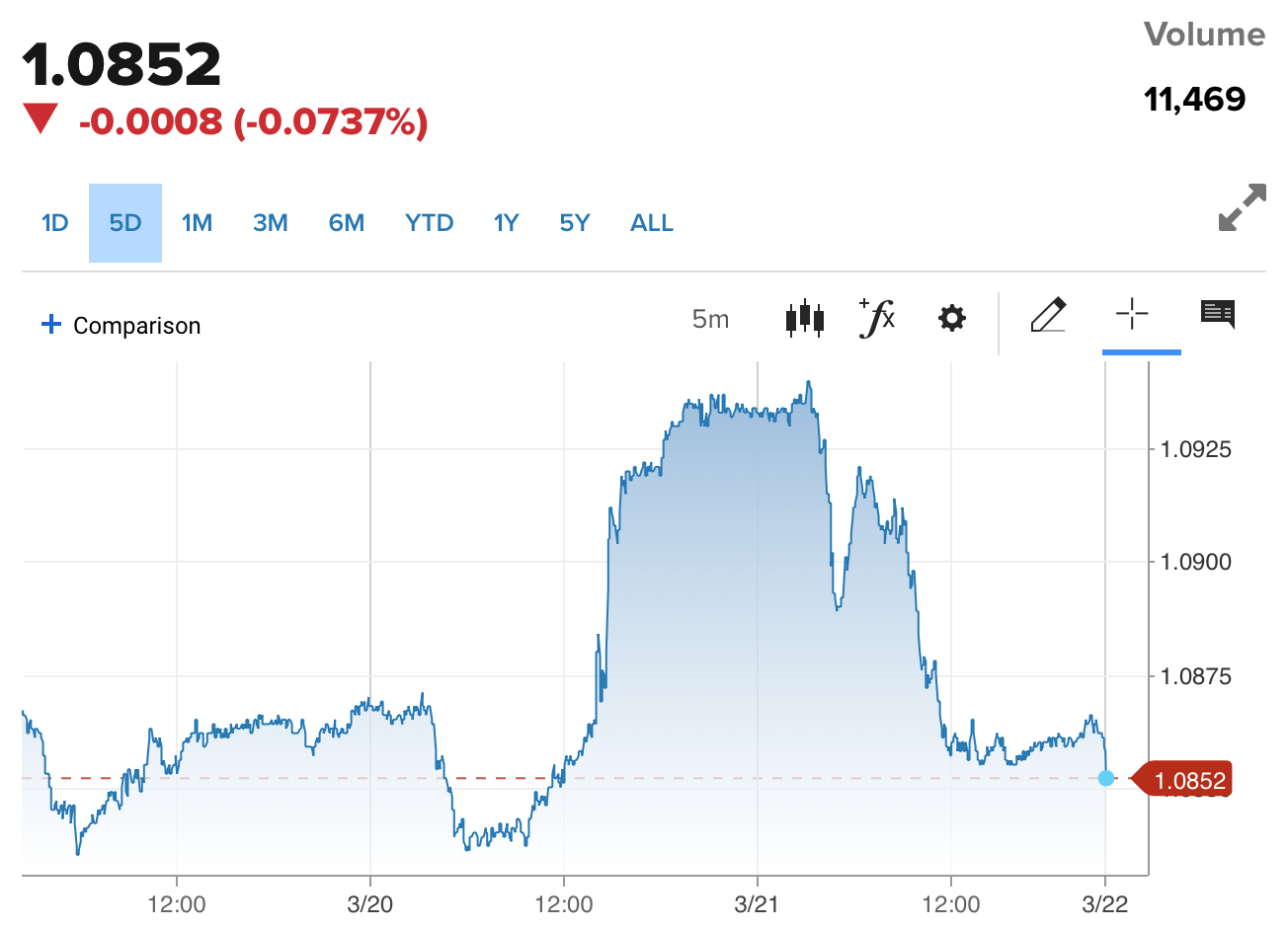 | Diễn biến tỷ giá EUR/USD trên thị trường thế giới (Nguồn: CNBC) |