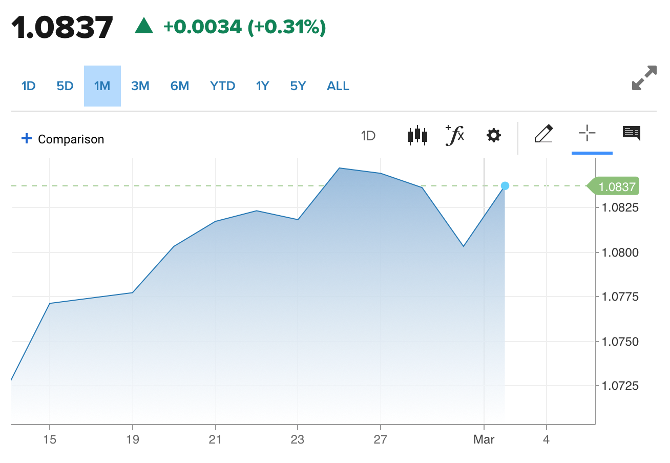 Diễn biến tỷ giá EUR/USD trên thị trường thế giới (Nguồn: CNBC)