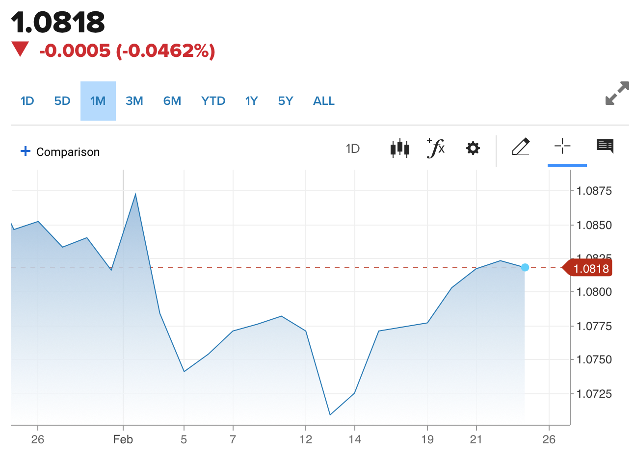 Diễn biến tỷ giá Euro trên thị trường thế giới cho thấy, chỉ số EUR/USD hiện đang ở mức 1.0818, giảm 0.0005 điểm, tương đương 0.0462% so với phiên trước.