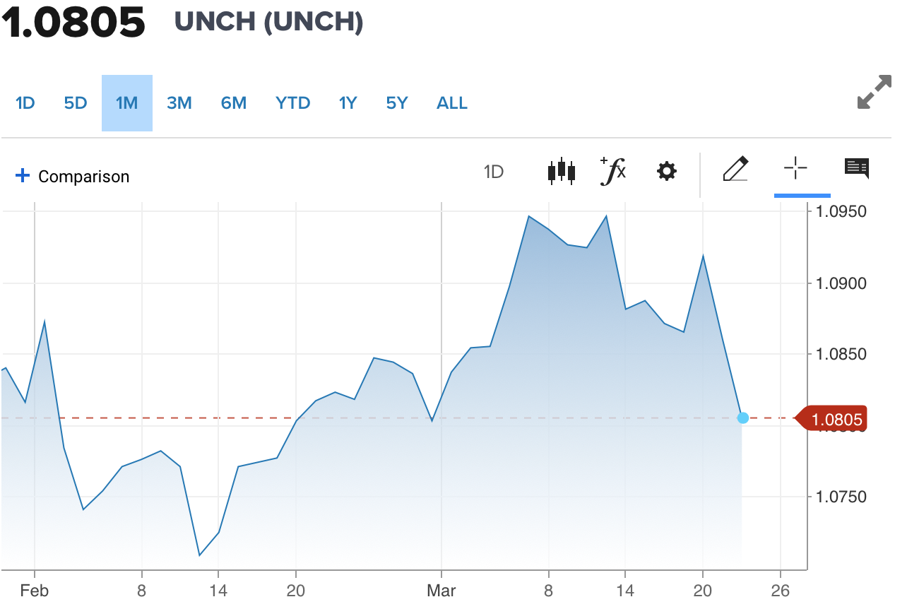 Diễn biến tỷ giá Euro trên thị trường thế giới cho thấy, chỉ số EUR/USD hiện đang ở mức 1.0805,đi ngang so với phiên trước.