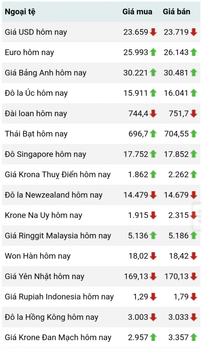 Hôm nay Ngân hàng Sài Gòn mua Euro (EUR) giá cao nhất là 27.230,00 VNĐ/EUR. Bán Euro (EUR) thấp nhất là Ngân hàng Công Thương Việt Nam với 26.469,00 VNĐ một EUR.