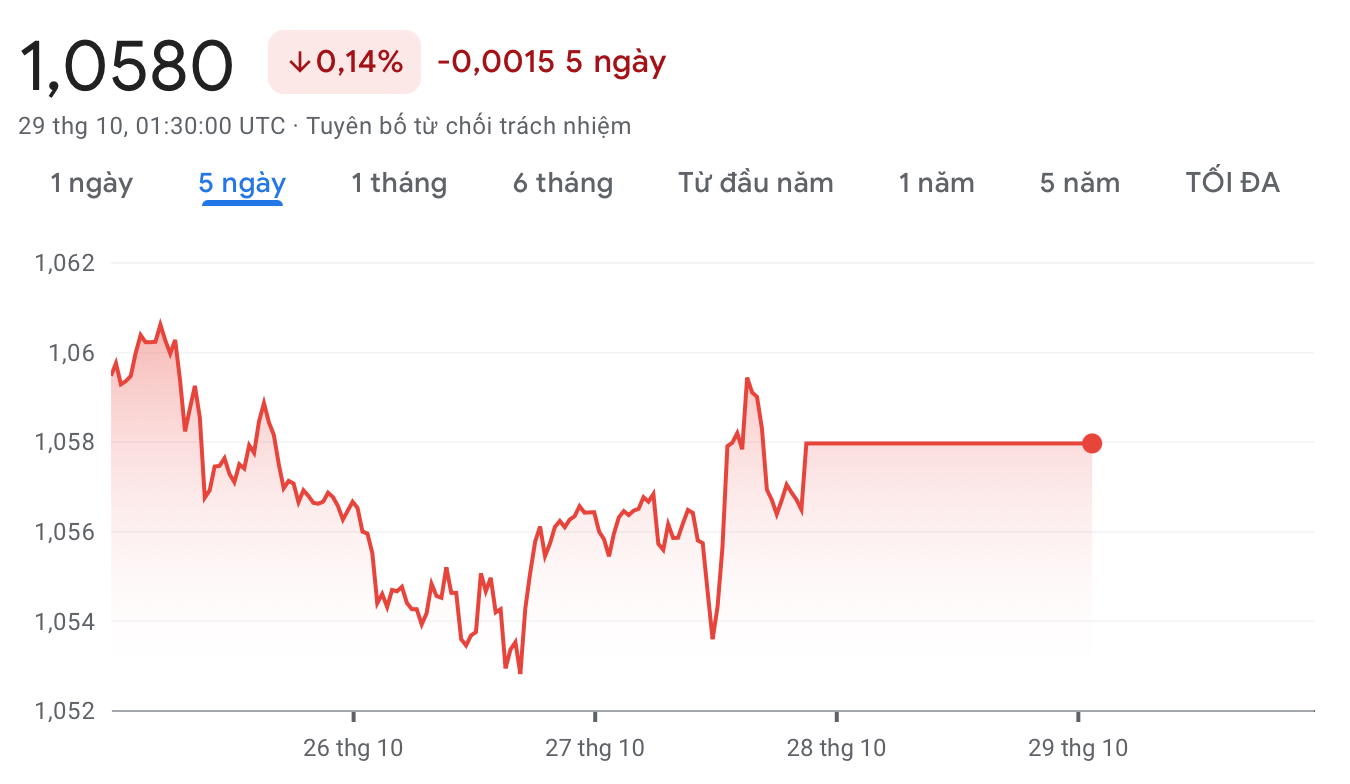 Diễn biến tỷ giá Euro trên thị trường thế giới cho thấy, chỉ số EUR/USD hiện đang ở mức 1.0580, giảm 0.0015 điểm, tương đương 0.14% so với giữa tuần.