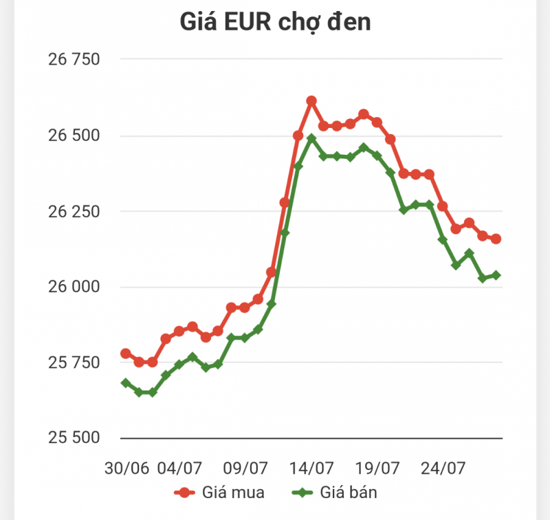 Hôm nay 29/7/2023 khảo sát tại thị trường chợ đen cho thấy xu hướng giảm từ đầu buổi của EUR so với VND, theo đó tỷ giá Euro chợ đen mua vào là 26.029VND/EUR, bán ra là 26.149VND/EUR.