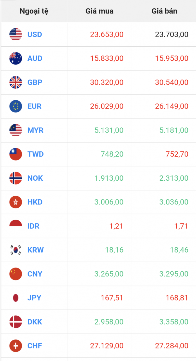 Tỷ giá Euro hôm nay 29/7/2023 khảo sát các ngân hàng lớn cho thấy tỷ giá ở chiều mua vào không có ngân hàng tăng giá mua, 2 ngân hàng giảm giá mua và 5 ngân hàng giữ nguyên giá mua vào so với hôm qua. Trong khi đó chiều bán ra không có ngân hàng tăng giá bán ra, 1 ngân hàng giảm giá bán và 6 ngân hàng giữ nguyên giá bán so với hôm qua.